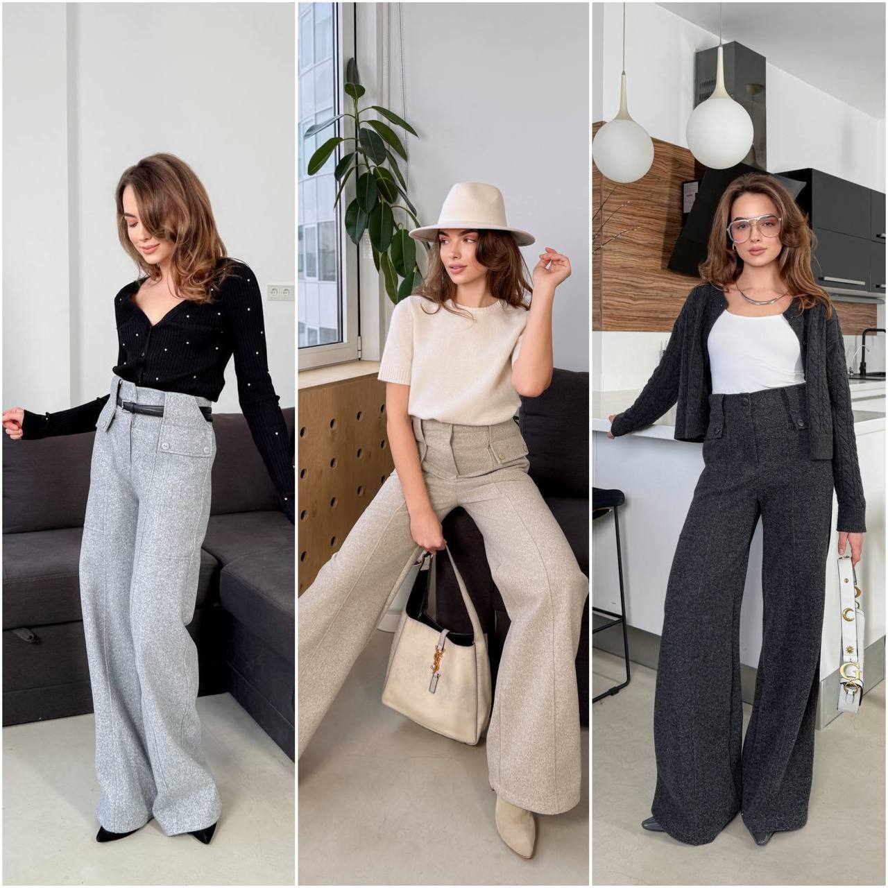 Опис: Наші вовняні штани є комфортними, стильними штанами виконані у вільному стилі. Вони мають широкі штанини та декоративні шви, які додають їм структурності.