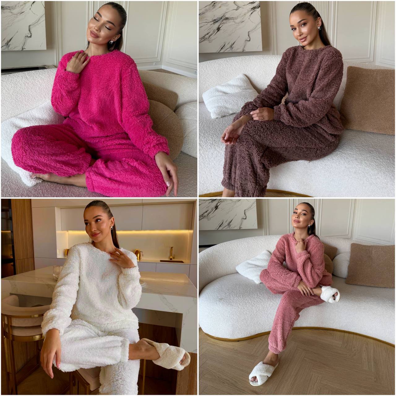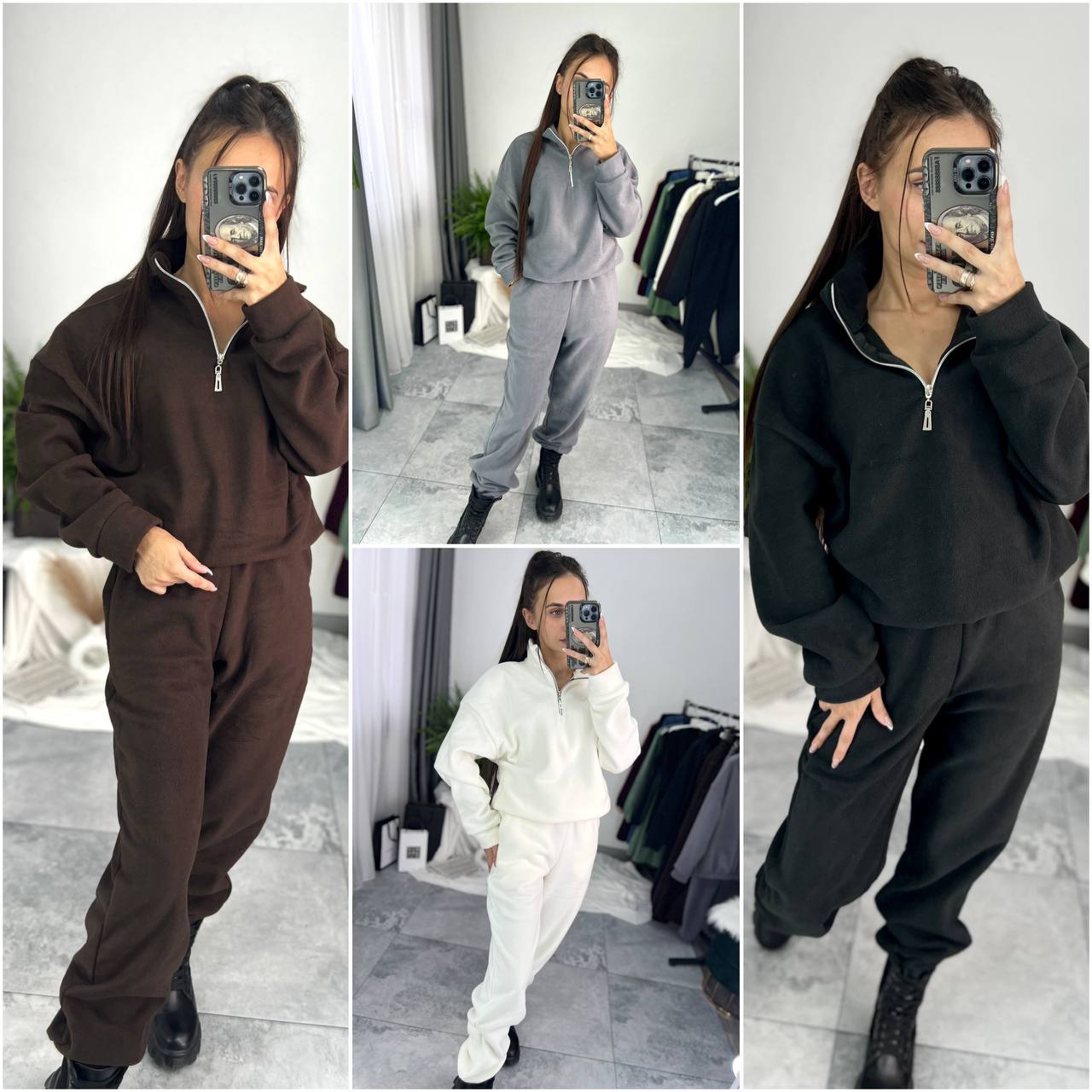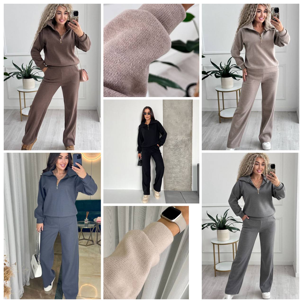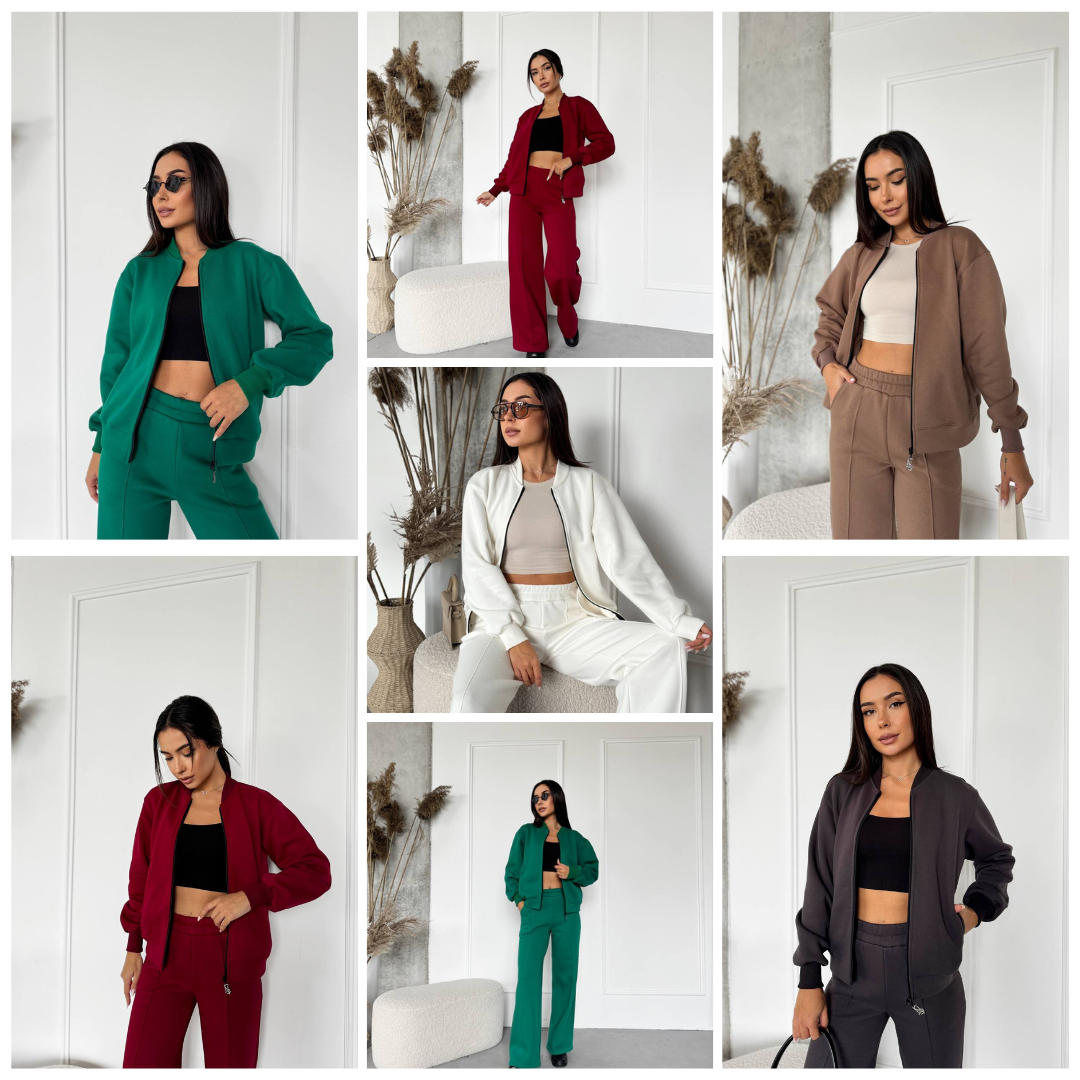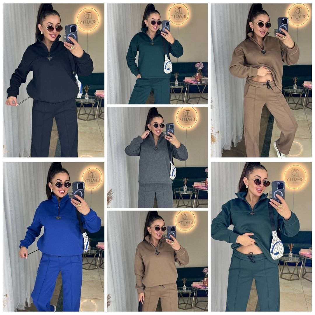 Опис: Базовий, теплий костюм. Кофта на блискавці з кишенями. Манжети, ворот та низ виробу оздоблені трикотажною рібаною. Штани високої посадки, з кишенями.